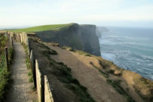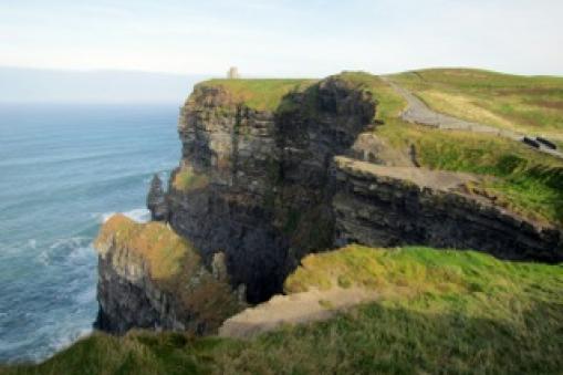 The Cliffs of Moher are spectacular. 214 metres at their highest point. Home to thousands of nesting birds. The misty air had my thoughts drawn towards the sea below. Limestone and shale exposed to the constant pounding of the rolling ocean. I am not crazy about heights. What a long way to fall. The nearer I came to the edge the more insecure I felt. A nasty thought of the ground giving way fluttered about in my mind. Off to my right O'Brien's Tower proudly stood at the cliffs highest point. It's relavence dwarfed by the presence of the cliffs. Thrilling.